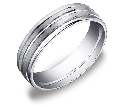 Contrasting finishes give this 6mm comfort fit men's wedding band a distinctive look. Crafted in popular and durable 14 karat white gold, it boasts a satin finish with a polished center cut and polished borders. The comfort fit design features a rounded polished interior that allows the ring to slide easily and rest comfortably on the finger. Made in the USA